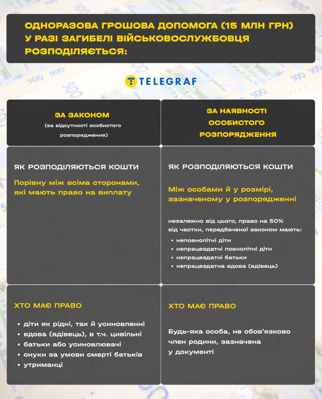 Водночас існує обмеження: незалежно від волі військового, частина грошей все одно має бути виплачена непрацездатним родичам.