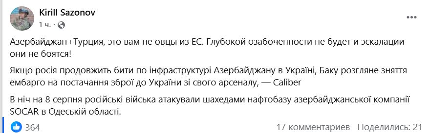 В Україні вже відреагували на цю новину. Наприклад, політолог Кирило Сазонов зазначив, що Азербайджан, як і Туреччина, не бояться йти на ескалацію, а тому не гратимуть у ігри з "глибоким занепокоєнням".
