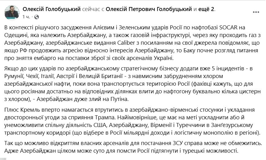 Політолог Олексій Голобуцький своєю чергою додав, що Азербайджан має й інші причини допомогти Україні. Це включає інциденти із забрудненням хлором азербайджанської нафти, що проходить територією Росії, а також спроби Кремля втрутитися в угоду щодо врегулювання конфлікту з Вірменією.