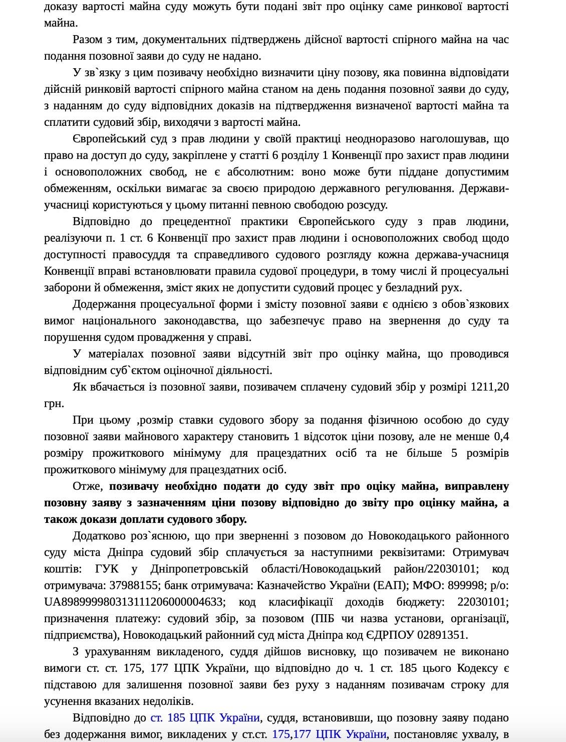 Суддя зазначив, що для визначення вартості майна позивача має надати оцінку, виконану суб’єктом оціночної діяльності, відповідно до Закону "Про оцінку майна, майнових прав та професійної оціночної діяльності в Україні". У документі також зазначено, що у разі невиконання вимог постанови позов буде визнано неподаним та повернено заявнику.