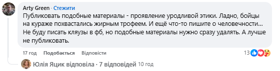 Колишній офіцер ЗСУ Arty Green розкритикував допис народної депутатки. На його думку, подібний контент не варто викладати у відкритий доступ.