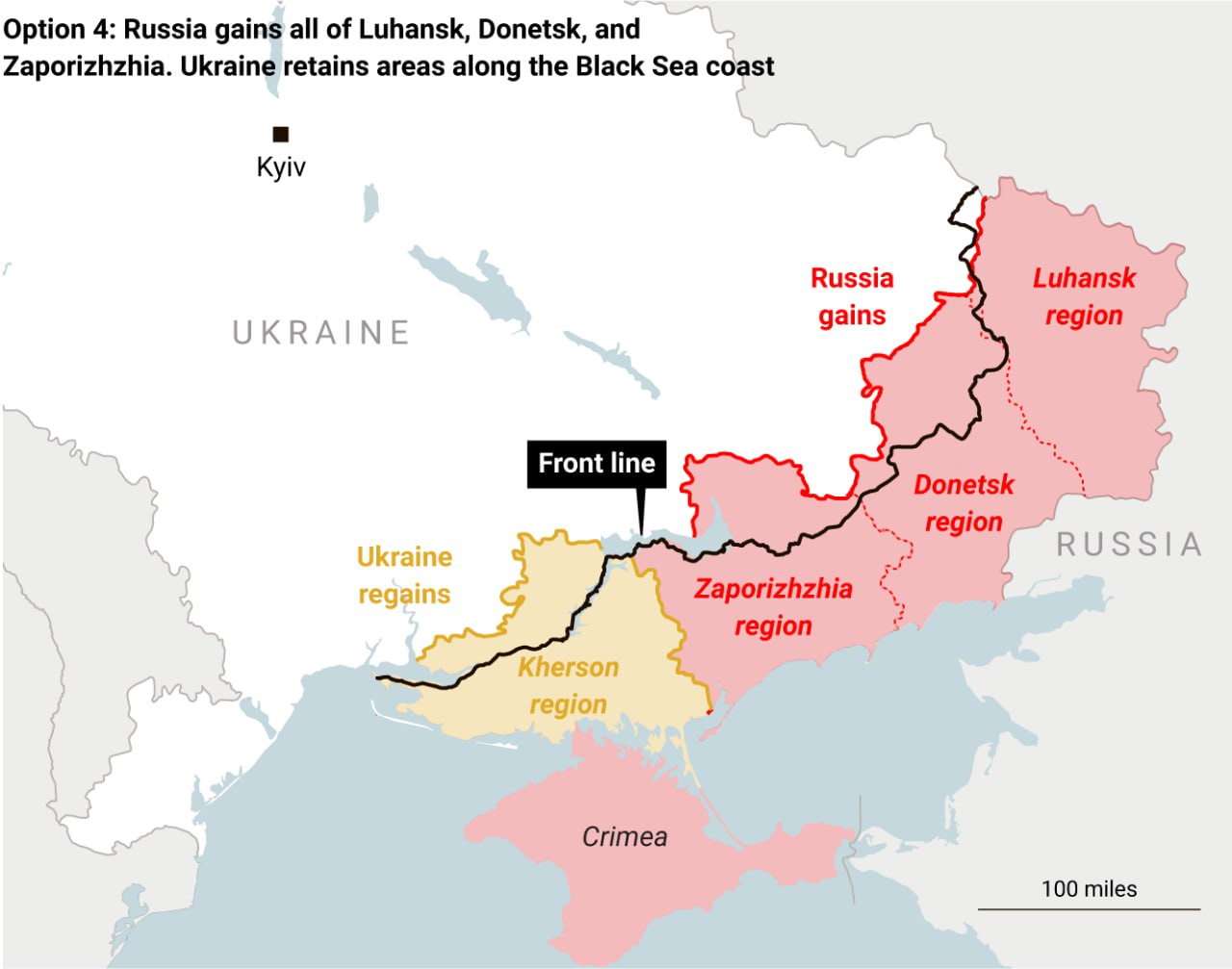 У 2022 році Путін підписав декларації про анексію Луганської, Донецької, Запорізької та Херсонської областей. Російські війська ніколи не контролювали обласний центр Запоріжжя та були вибиті з північного Херсона під час контрнаступу у 2022 році. Але в міру просування російських військ Путін може вимагати від України подальших територіальних поступок платою за мир і спробувати захопити всі чотири області.