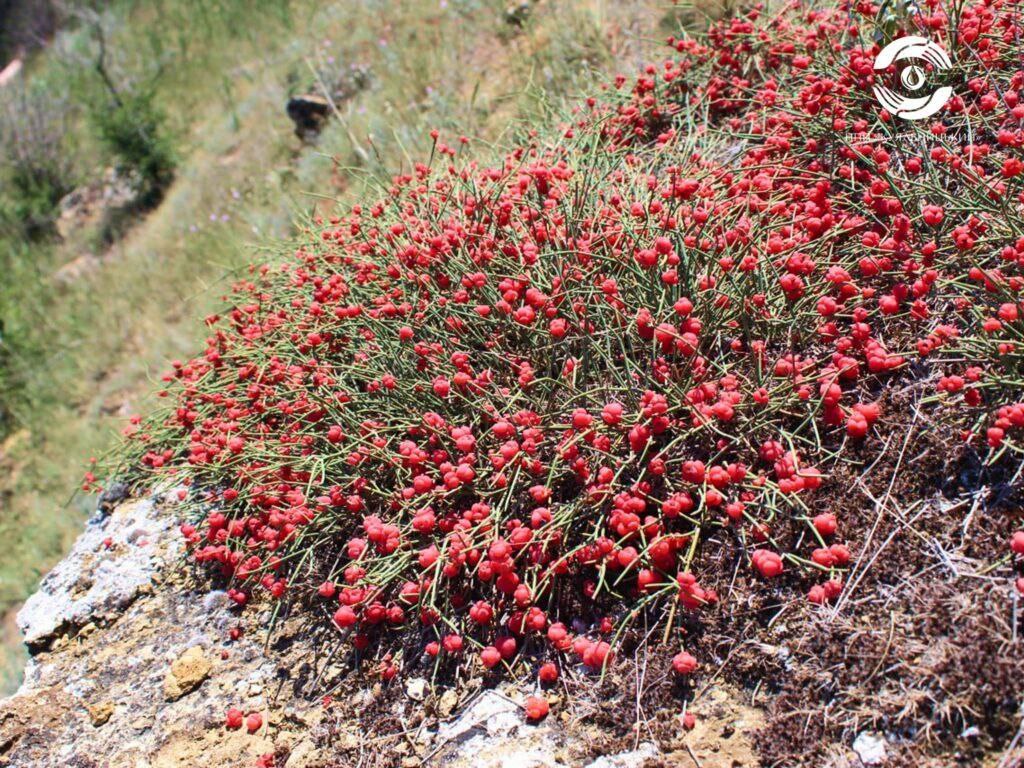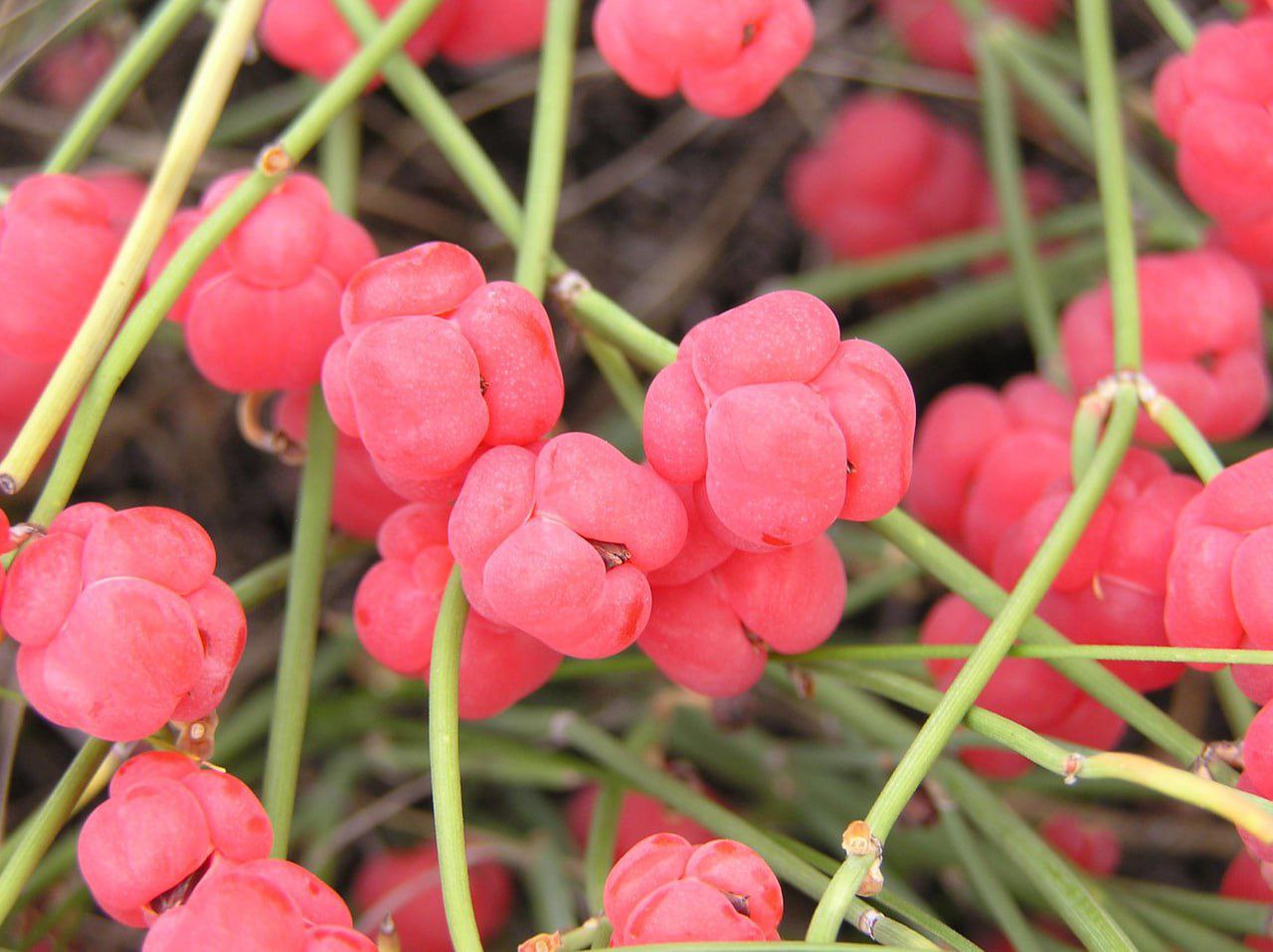 Червоні ягоди ефедри лежать прямо на землі. Ззовні вони нагадують малину. Починають рясно рости вони з липня. З ботанічного погляду це шишкоягоди або супліддя. Росте така рослина тільки в степу.