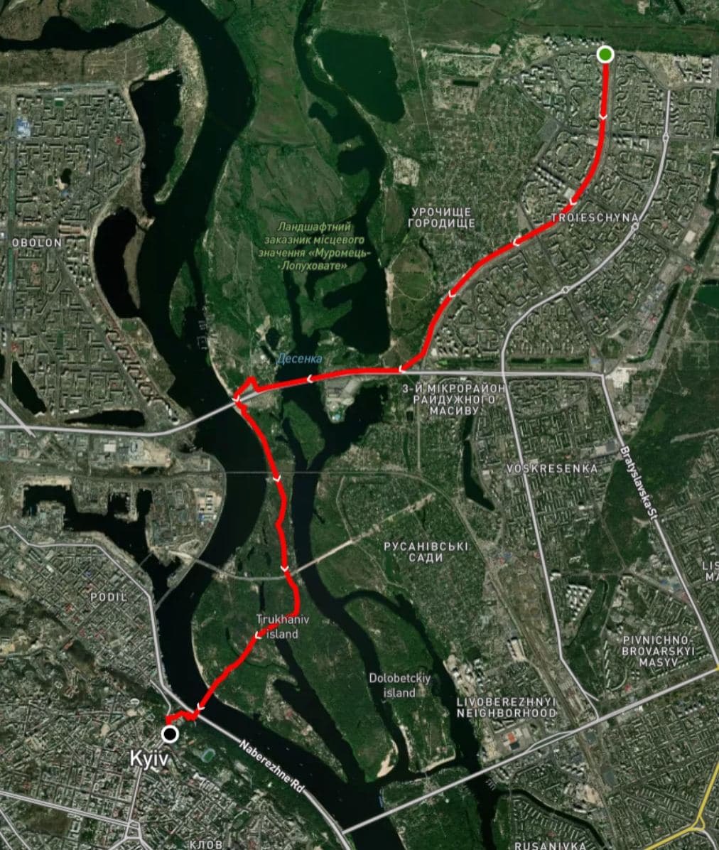 Велосипедна траса красива і безпечна, оскільки оформлена в окрему смугу. Маршрут пролягає по проспекту Романа Шухевича, Північному мосту, вулиці Труханівській, Парковому мосту, схилах Хрещатого парку, Володимирському спуску та Європейській площі.