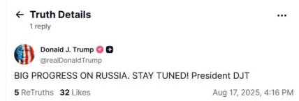 Оновлено: Президент США Дональд Трамп у власній соцмережі написав, що є великий прогрес щодо Росії.