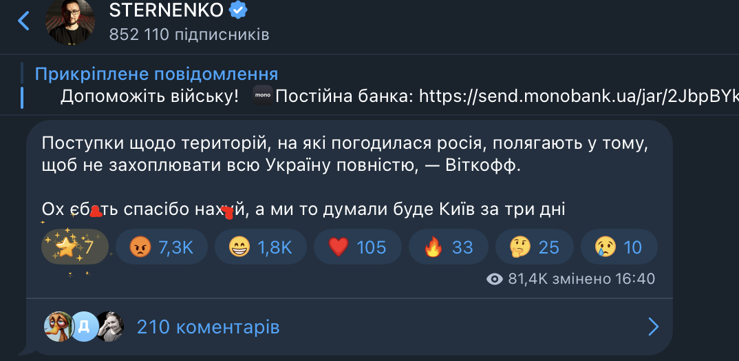 Відомий волонтер Сергій Стерненко був більш жорстокий у своїх висловлюваннях щодо заяви Віткоффа.