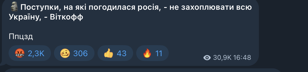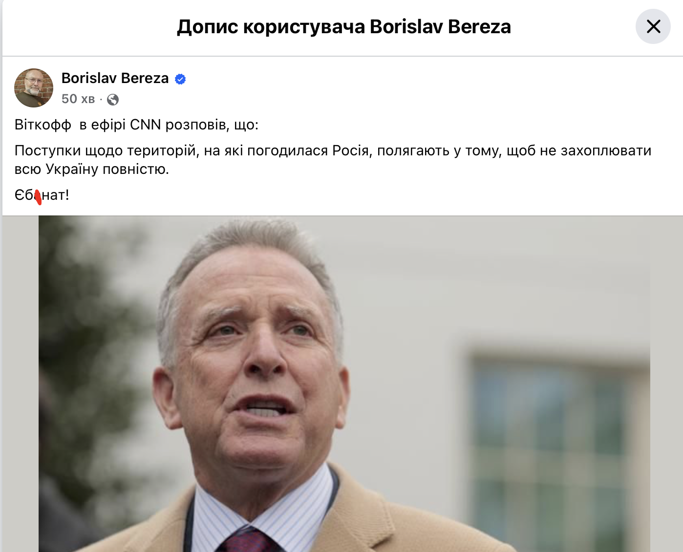 Керівник Центру Вивчення окупації Петро Андрющенко на своїй сторінці у Телеграм відреагував на заяву Віткоффа. Ось що він написав: