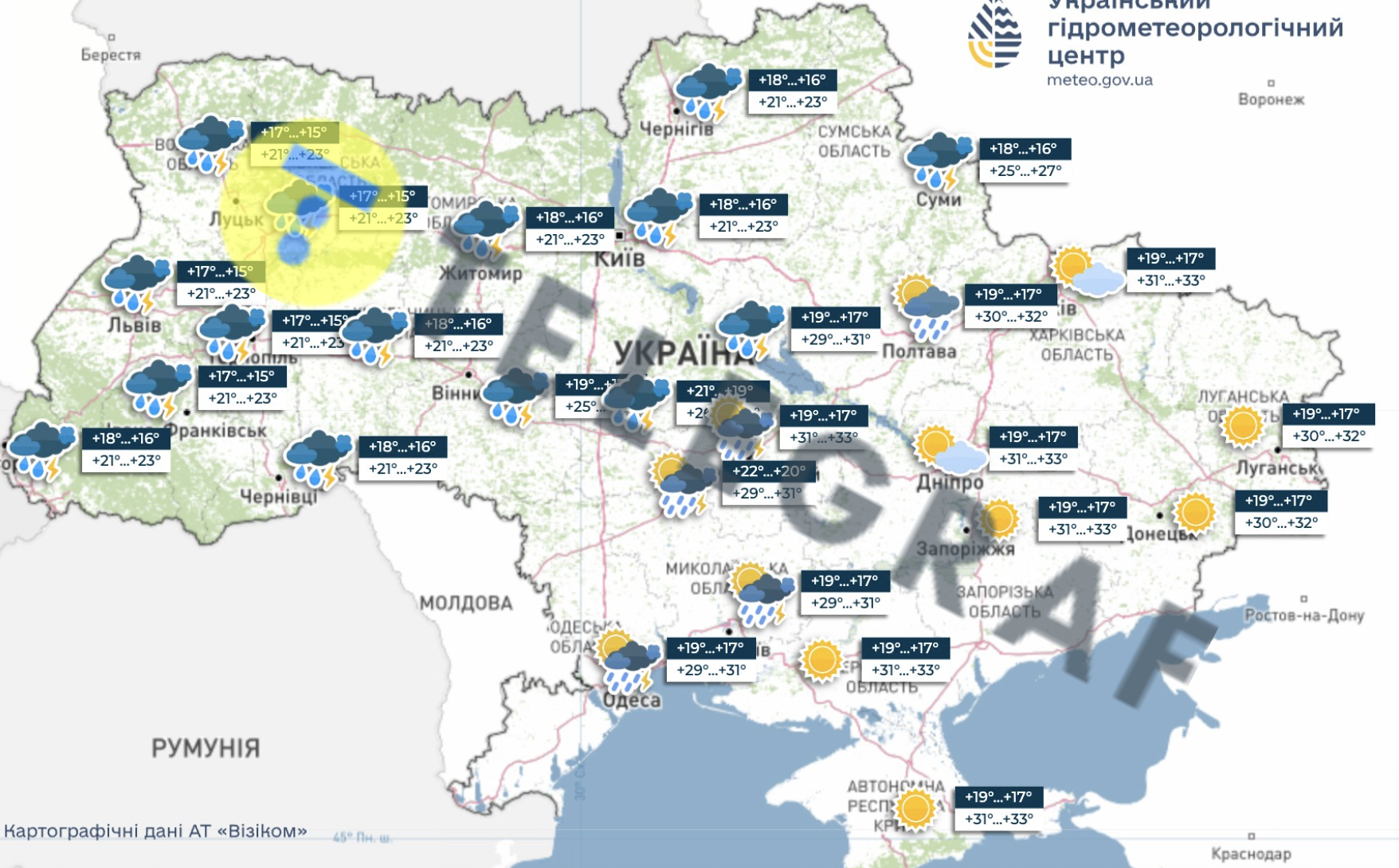 На заході країни опади прогнозуються протягом дня, подекуди буде навіть злива. Стовпчик термометра вдень коливатиметься від +21 до +23 градусів, а вночі опуститься до +16 градусів. Північні області також очікує дощ з грозою і температурними межами +21 … +23 градуси.