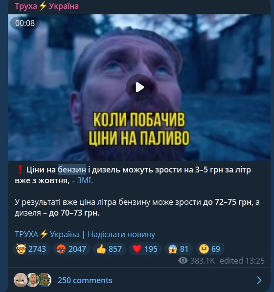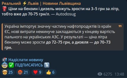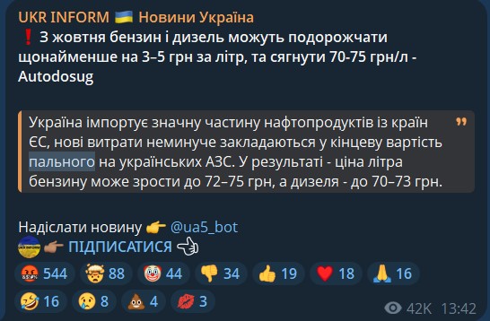 За даними видання Autodosug, з жовтня бензин і дизель можуть подорожчати щонайменше на 3-5 грн за літр. Ціна літра бензину може зрости до 72-75 грн, а дизеля — до 70-73 грн. Однак ці розрахунки викликають питання, адже нині А-95 коштує 58,92 грн за літр, і до 75 гривень різниця становить майже 17 гривень, а не 3-5. Інформацію про це поширили у багатьох телеграм-каналах. Деякі із них мають сотні тисяч підписників.