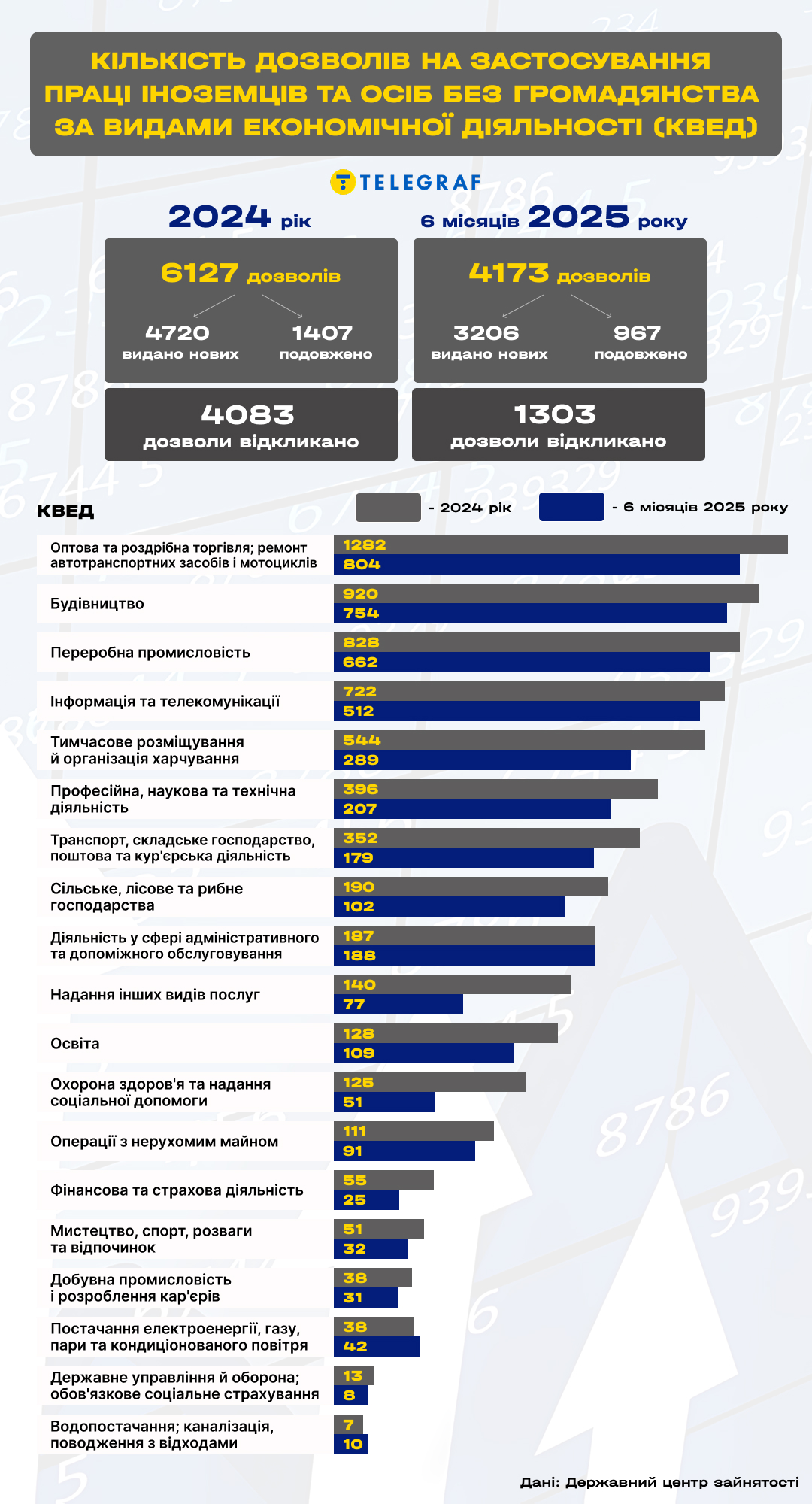 Ще один варіант – іноземні працівники. Офіційна кількість закордонних фахівців, що залучались до ринку праці в Україні була на піку у 2021-му році. Тоді служба зайнятості надала 21,7 тис. дозволів на працевлаштування. Але в наступні роки через активну фазу бойових дій цей показник зменшився в рази. За даними Державного центру зайнятості у 2022 та 2024 році іноземці отримали понад 6 тис. дозволів (в цій цифрі як нові документи, так й ті, термін дії яких було подовжено), а у 2023 – 4,5 тисячі. За перше півріччя поточного року кількість дозволів майже наблизилась до цього показника і становила 4,1 тисячі.