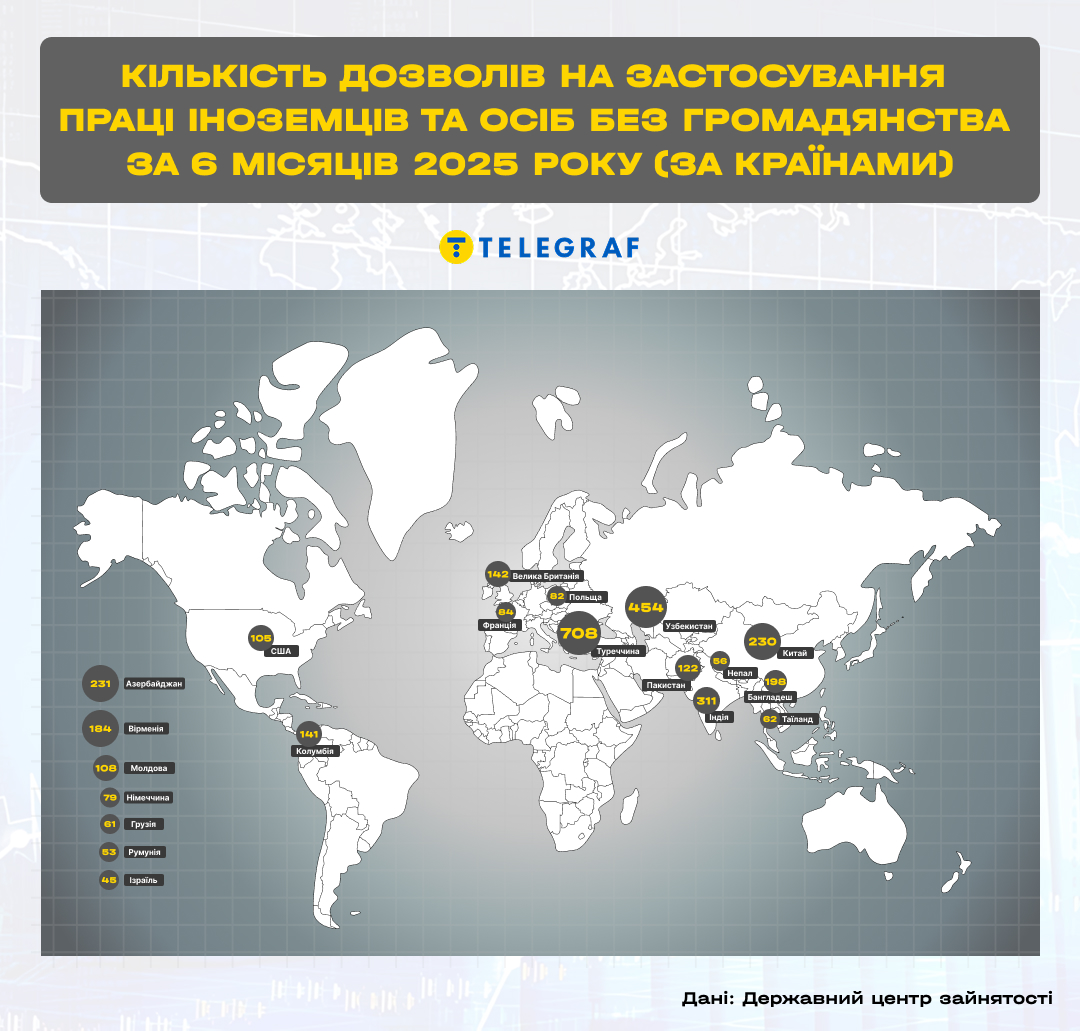 Серед десятки країн, що останні півтора року є ТОП-3 постачальників робочої сили, в Держцентрі зайнятості у відповіді на запит "Телеграфу" називають Туреччину, Узбекистан та Індію. Минулого року з 4 по 10 місце за кількістю працівників дали Китай, Азербайджан, Великобританія та США, Бангладеш, Франція та Німеччина. А цього року на цих позиціях лишились лише дві країни — Великорибтанія та Бангладеш, решту лідерів замінили Вірменія, Колумбія, Пакистан та Республіка Молдова.