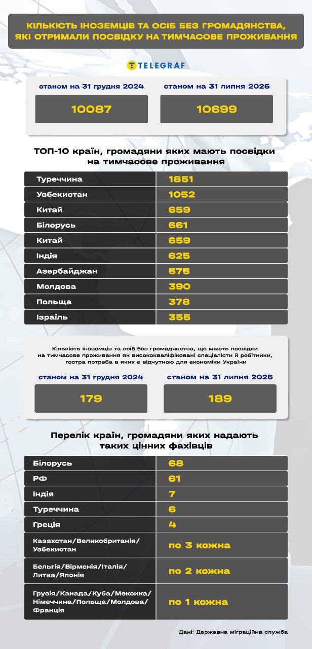 При цьому за даними Державної міграційної служби посвідки на тимчасове проживання у зв'язку з працевлаштуванням на кінець липня цього року мають більш ніж 10 тис. іноземців. Й в цьому рейтингу крім Туреччини, Узбекистану, Китаю та Індії, є також Білорусь, громадяни якої мають такі документи в майже тій же кількості (більш ніж 600), що й індуси та китайці. Майже по 400 посвідок на руках у громадян Молдови та Польщі, а понад 300 – Ізраїлю, Грузії та Великої Британії.
