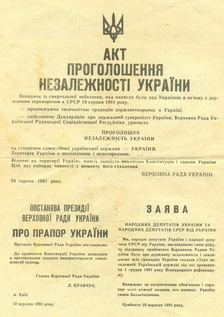 Паралельно радянська система продовжувала бурлити. Вже в серпні 1991 року спалахнув путч, який прискорив розпад СРСР. 24 серпня Верховна Рада УРСР ухвалила вже повноцінний Акт проголошення незалежності України — документ, який остаточно закріпив вихід України зі складу Союзу.