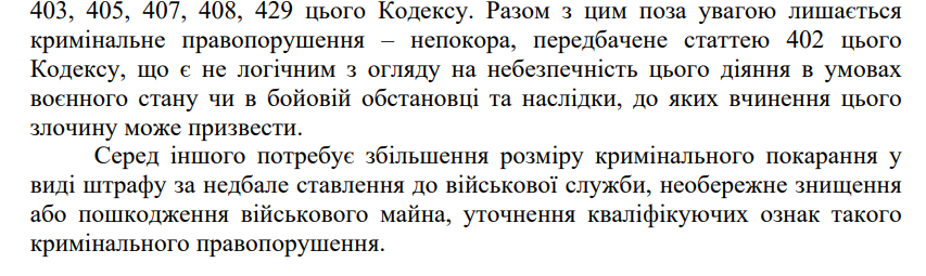 Наразі в Кримінальному кодексі вже діють обмеження для деяких воєнних злочинів. Наприклад, за дезертирство чи самовільне залишення частини під час воєнного стану суд не може дати умовний термін — передбачено лише реальний висновок. Але стаття 402 КК щодо непокори до цього переліку не входить. Тому сьогодні за непокору можна отримати й умовний термін, якщо суд вирішить, що цього вистачить. Депутати вважають, що це потрібно виправити.