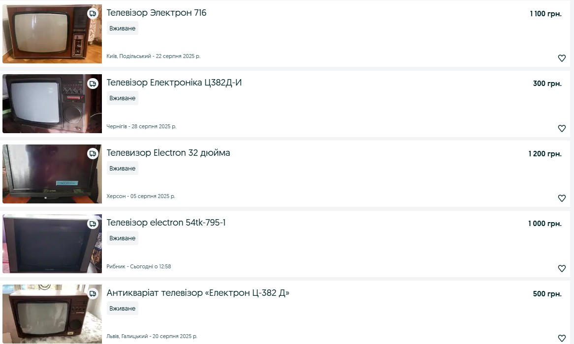 Сьогодні телевізори "Електрон" продаються як антикваріат на торгових майданчиках. На OLX можна знайти чорно-білі моделі за 350-500 гривень, кольорові — за 1000 гривень.