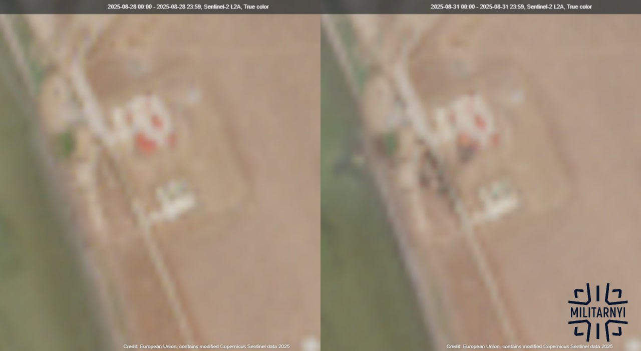 Факт прильоту підтверджують супутникові фотографії Copernicus Data Space Ecosystem. Лівий знімок було зроблено 28 серпня, а правий — 31 серпня.