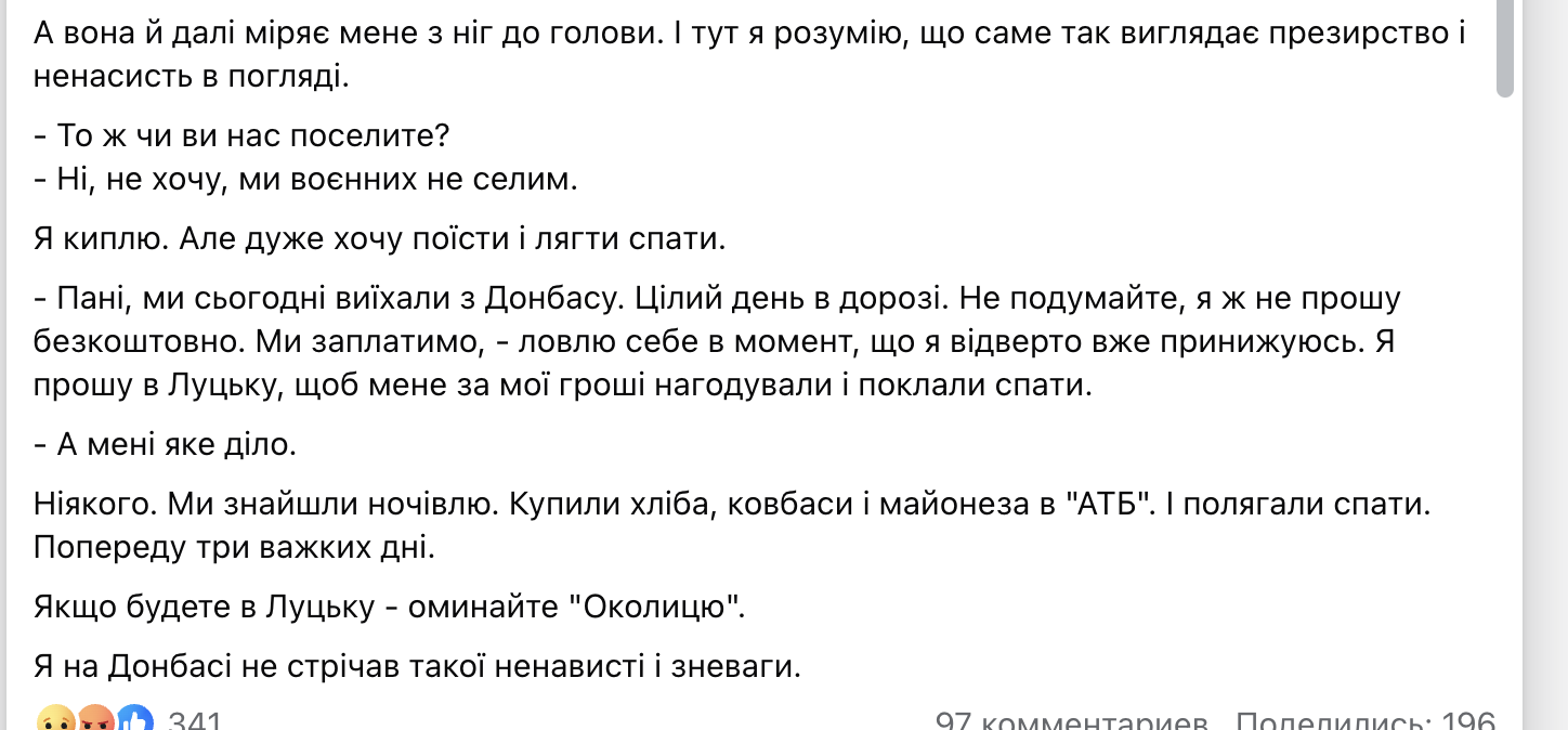 - Пані, ми сьогодні виїхали з Донбасу. Цілий день в дорозі. Не подумайте, я ж не прошу безкоштовно. Ми заплатимо, — ловлю себе в момент, що я відверто вже принижуюсь. Я прошу в Луцьку, щоб мене за мої гроші нагодували і поклали спати.