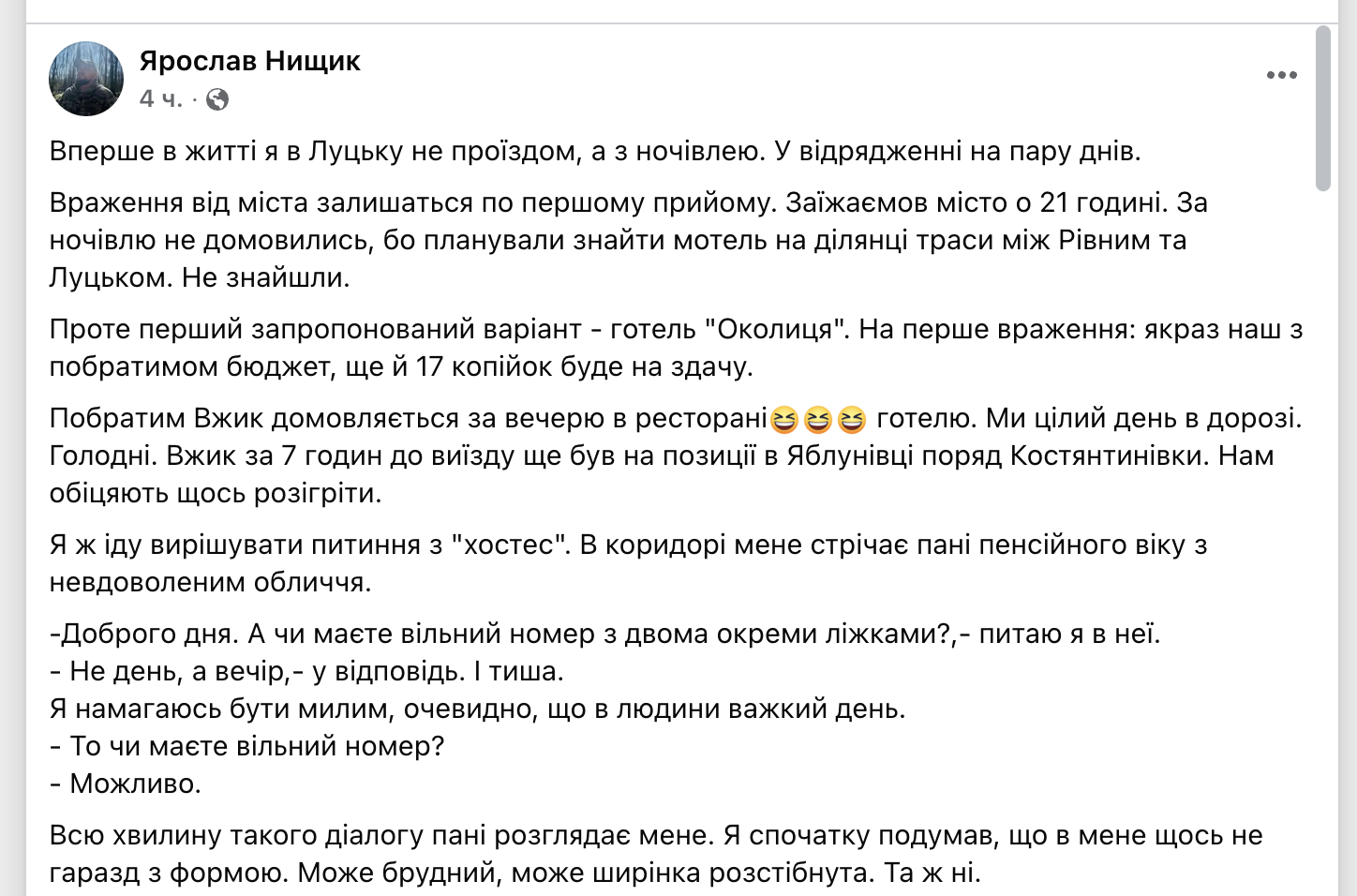 Як пише Нищик, він з побратимами приїхав у Луцьк у відрядження. Вони не забронювали номер завчасно і вирішили поселитись у перший готель, який трапиться. Ним виявилася "Околиця". Чоловіки розділились: Ярослав пішов домовлятись за номер у готель, а його побратим замовити вечерю у кафе. Адже приїхали вони близько 21:00 і були втомлені та голодні.