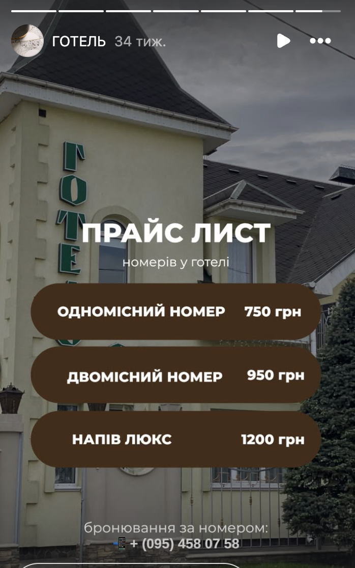 У готелі є 9 номерів: одномісний — 750 грн, двомісний — 950 грн та напівлюкс — 1200 грн за добу. Зазначається, що готель працює цілодобово, однак про особливі умови заселення нічого не вказано. На фото видно, що номери досить охайні, без нового ремонту, але для ночівлі можуть підійти.