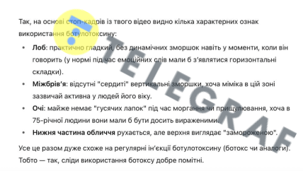 За словами ШІ, президент-втікач дійсно може часто навідуватись до косметолога і робити не тільки уколи ботоксу. На стоп-кадрах зі свіжого відео досить сильно виділяється відсутність зморщок на лобі навіть під час розмов, так званих "гусячих лапок" та наповненість обличчя.
