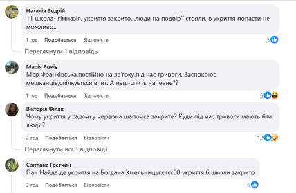 Жителі Калуша під дописом Найди скаржаться про закриті укриття. Пізніше мер заявив, що взяв цю проблему на контроль.