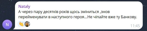 Дехто висловив більш стриману, але критичну позицію. Одна користувачка зауважила: "А через пару десятків років щось зміниться, знов перейменувати в наступного героя… Не чіпайте вже ту Банкову". Інші підкреслювали, що на тлі воєнного часу такі ініціативи виглядають як відволікання від реальних проблем. Так, одна з коментаторок написала, мовляв "просто важливе питання на цей час, всі питання вирішили тільки вулиці не перейменували".