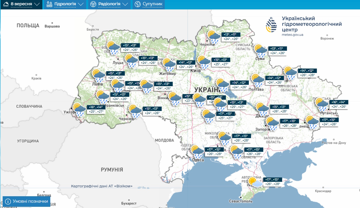 Короткочасні опади можливі практично на всій території України 8 вересня.