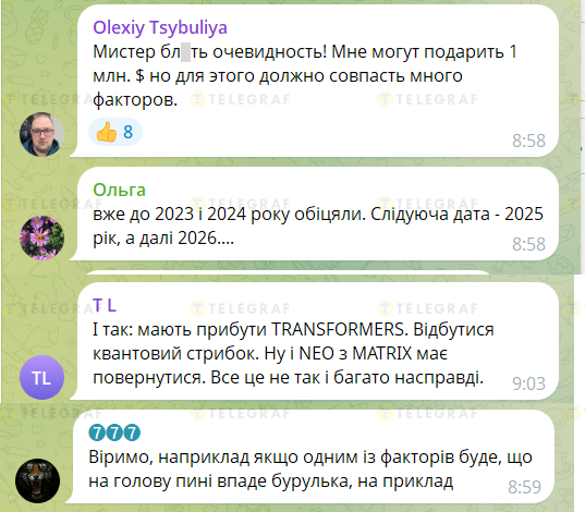 Слова Юсова не викликали ентузіазму в коментаторів, адже обіцянки та прогнози щодо завершення війни лунають досить часто. На гумористичний лад користувачів налаштувало згадування про "багато факторів". Вони припустили, що це може бути прибуття трансформерів, квантовий стрибок або ж бурулька, що впаде на голову російському президенту.