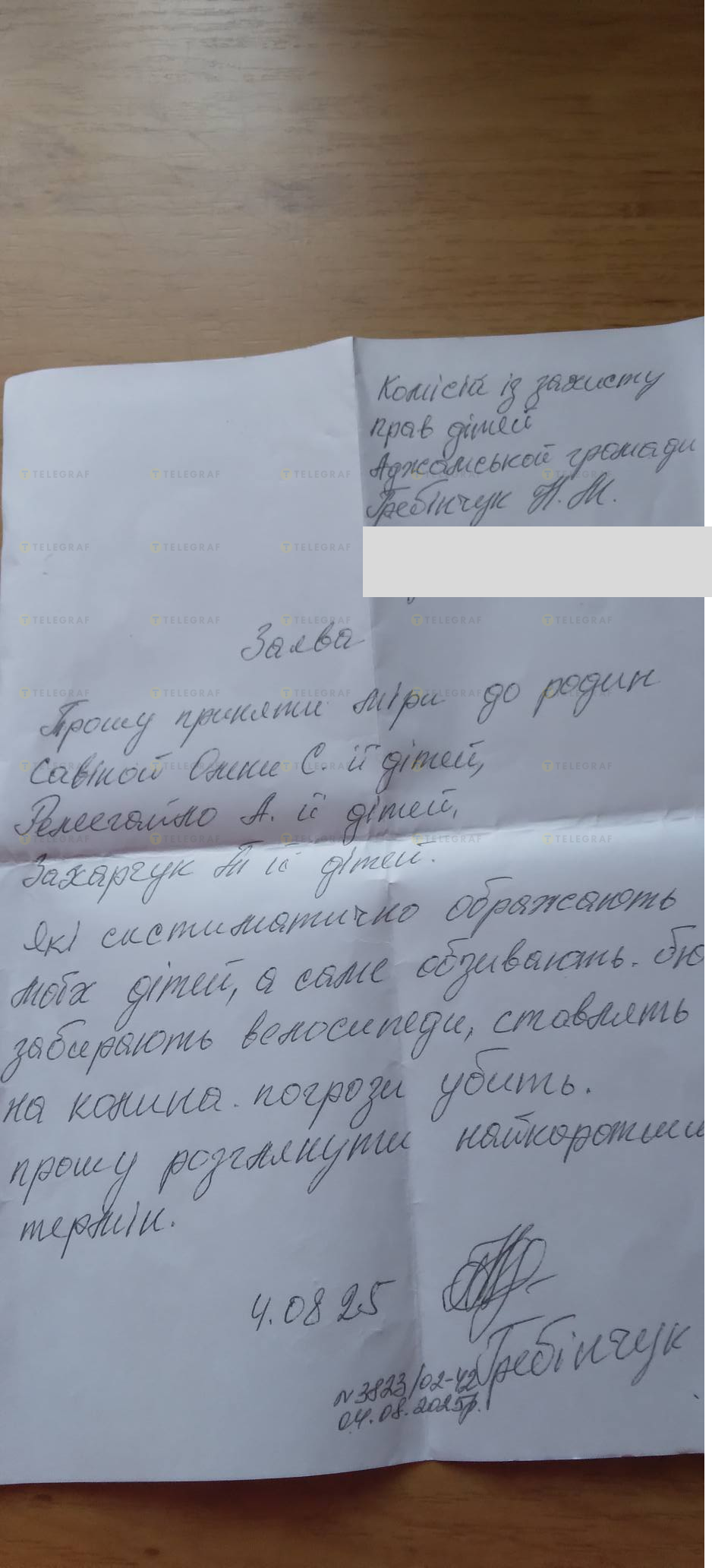 Ми опрацювали, у нас є акти обстеження фотографії від 06.08. Ми провели профилактично-роз'яснювальну роботу із даними родинами. Ми будемо тримати нейтралітет в даному питанні, тому що вони всі діти, вони всі наші. Я сподіваюсь, що вони знайдуть спільну мову з собою. На зустрічі, коли були в нас і з мамою, ми її рекомендували, щоб дітки не соприкасалися один з одним, щоб не було подальших конфліктів. Але, на жаль, діти на одному дитячому майданчику.
