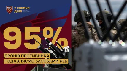 На лінії зіткнення на Донеччині 95% дронів противника придушується засобами РЕБ. Про це повідомив начальник відділення радіоелектронної та кіберборотьби 7 технокорпусу ДШВ Віктор Кордон.