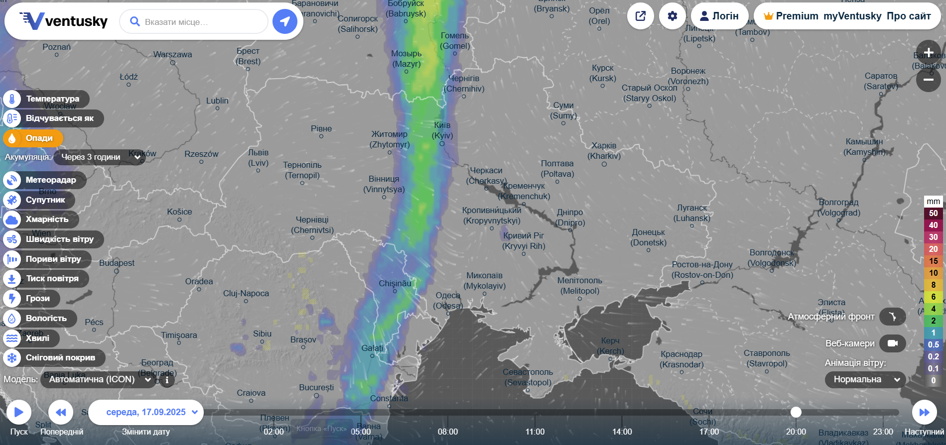 За даними "Ventusky", 17 вересня волога погода прогнозується на півночі та в західній частині України. Невеликі дощі пройдуть на Київщині, частині Житомирської та Вінницької областей, а також у північних районах Одещини. Максимальні показники цього дня становитимуть близько 2-3 міліметрів опадів.