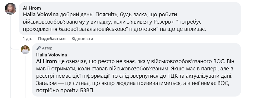 Якщо у військовозобов’язаного військово-облікова спеціальність є в паперових документах, але її немає в реєстрі, слід звернутися до територіального центру комплектування (ТЦК) та оновити дані. Такий запис у системі означає: якщо людина буде призиватися, а ВОС не внесена, їй доведеться пройти базову загальновійськову підготовку.