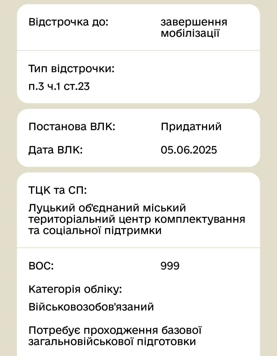 Окрім паперових облікових документів військовозобов'язані можуть мати додаток Резерв+. Днями, частина українців помітила в ньому зміни — після оновлення з'явився новий статус "потребує проходження базової загальновійськової підготовки". Зазначена військово-облікова спеціальність (ВОС) — 999.