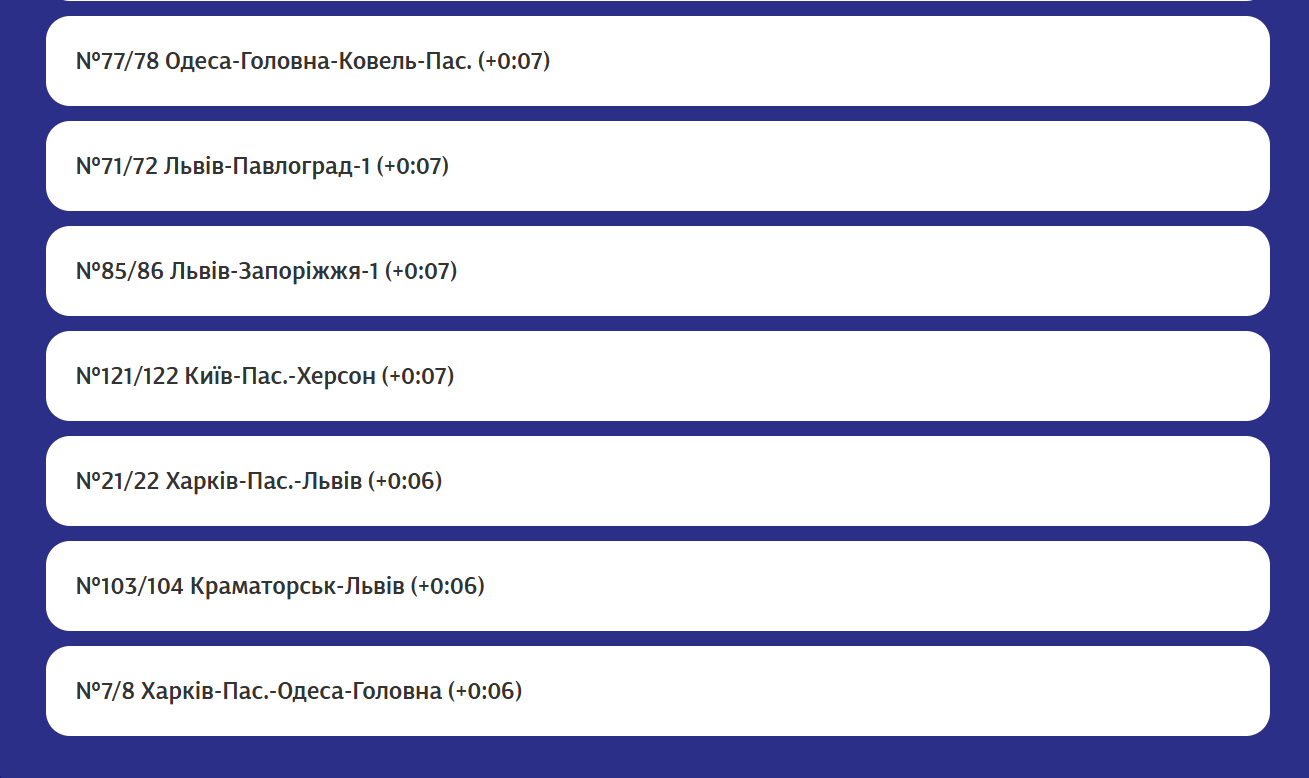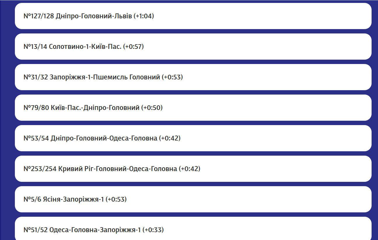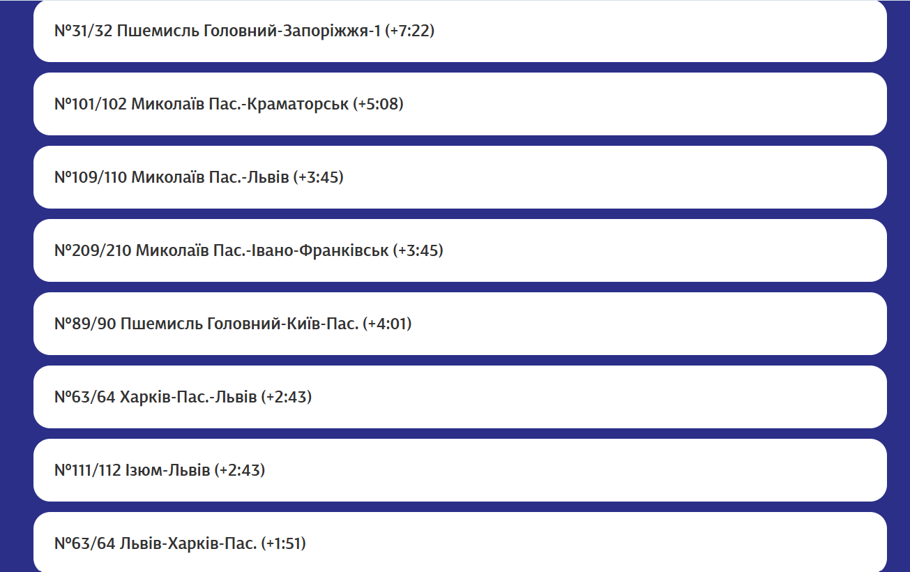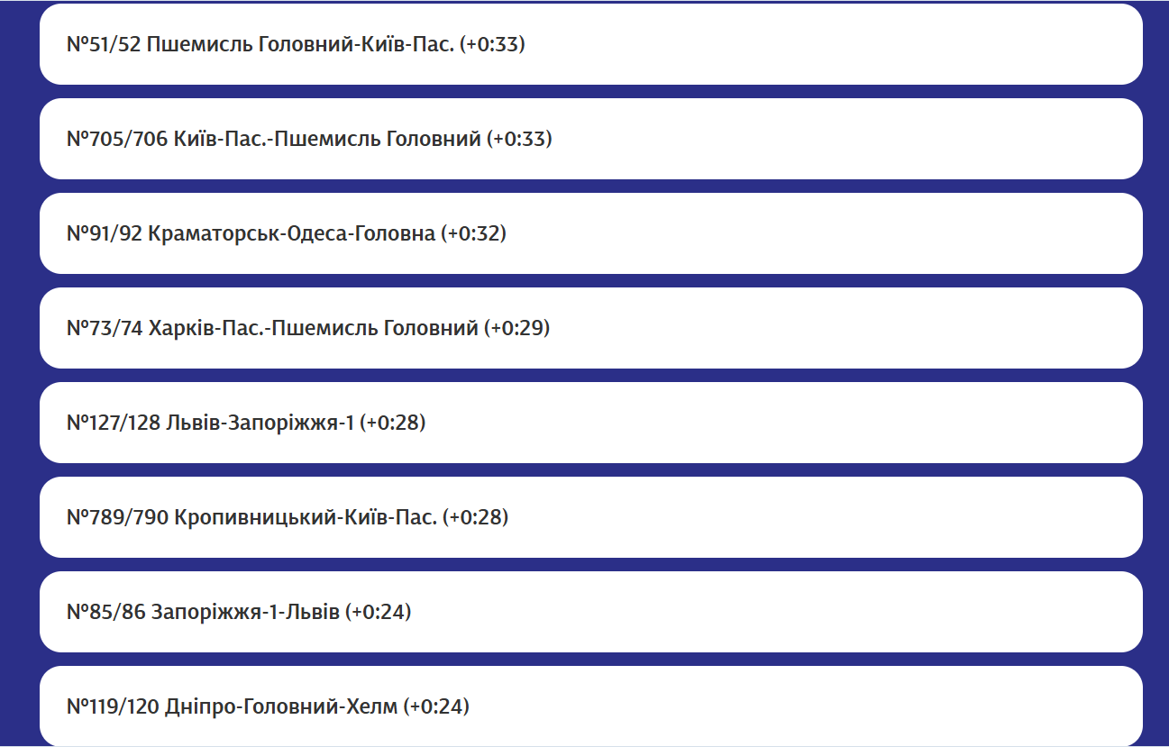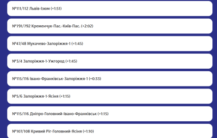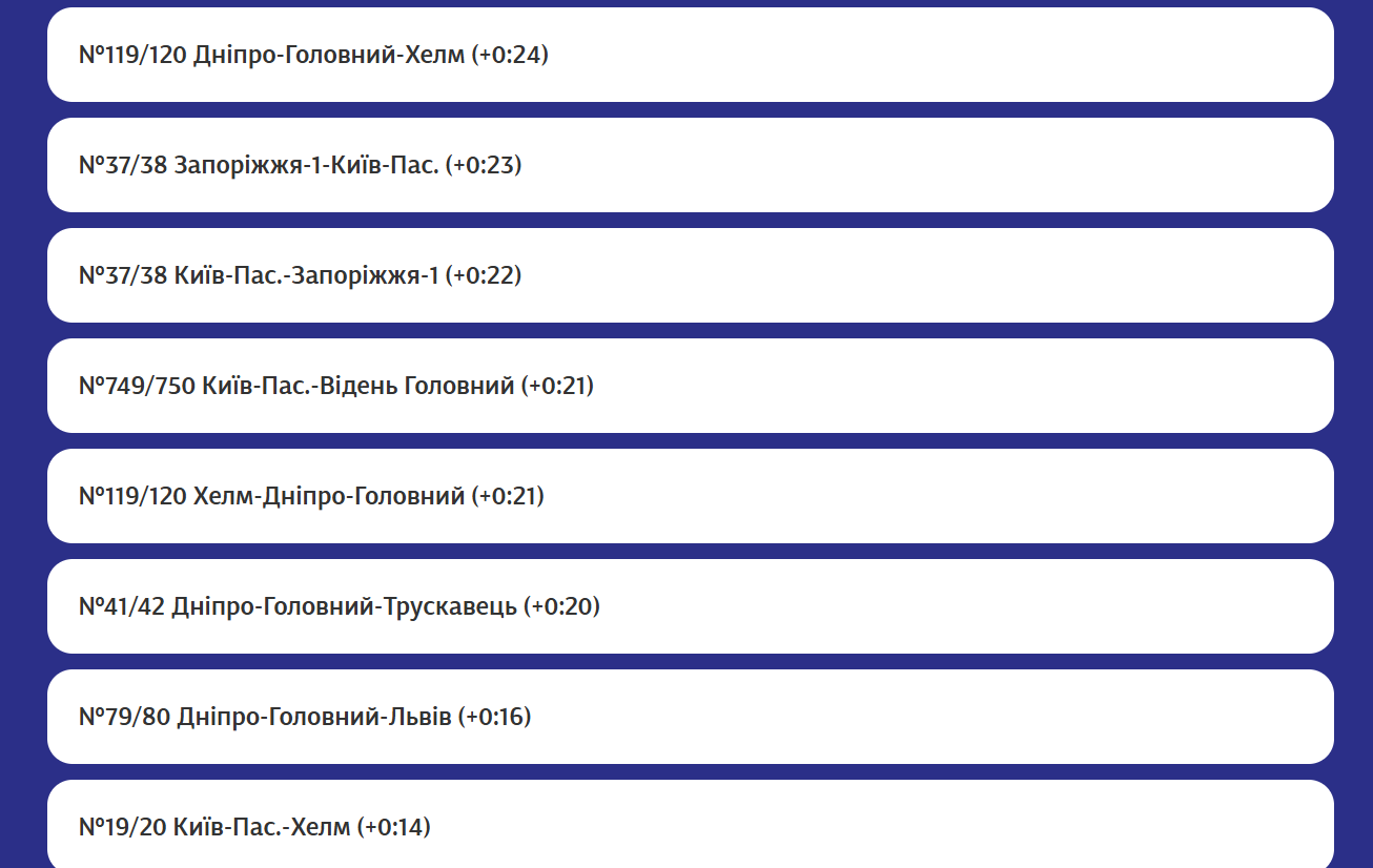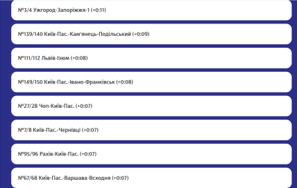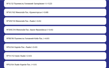 Через наслідки атаки РФ по інфраструктурі "Укрзалізниці" в ніч на 17 вересня, затримується низка поїздів. Оперативну інформацію про затримки поїздів можна дивитися за посиланням. Час затримок суттєвий — наприклад, поїзд №31/32 Пшемисль Головний-Запоріжжя-1 збільшує час у дорозі на 7:22 хвилини. На 4 години затримується поїзд №89/90 Пшемисль Головний-Київ-Пасажирський.