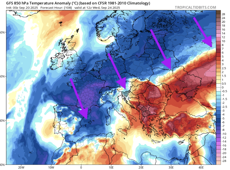 Очікуване проникнення холодної арктичної повітряної маси в Європу станом на 24 вересня. Стрілками показано напрямок розвитку похолодання, а синім кольором представлено відхилення температури від кліматичної норми в нижньому шарі тропосфери (на висоті 1,5 км від земної поверхні):