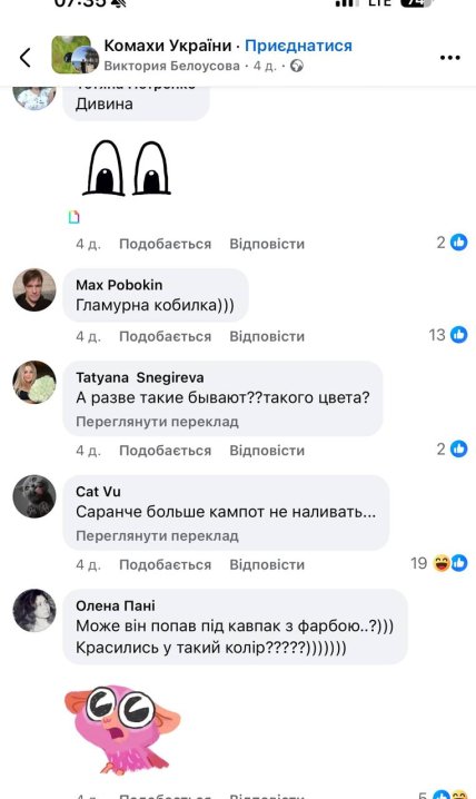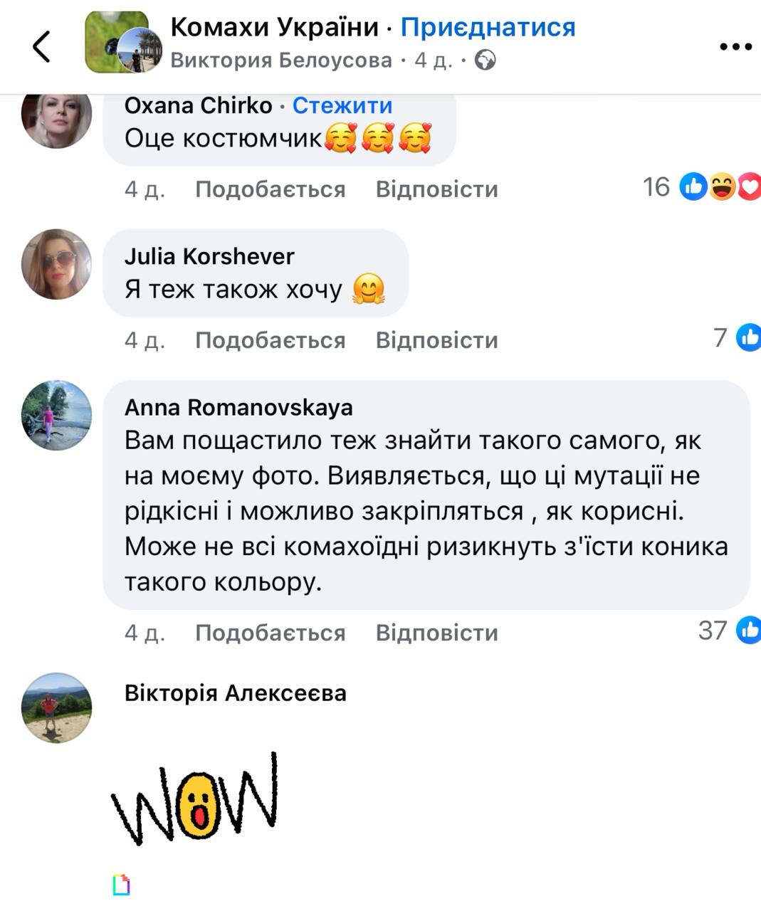 Користувачі соцмережі відреагували з великим подивом та захопленням. Хтось називав комаху дивиною, інший жартівливо охрестив її "гламурною кобилкою". Багато людей ставили питання, чи взагалі бувають комахи такого кольору