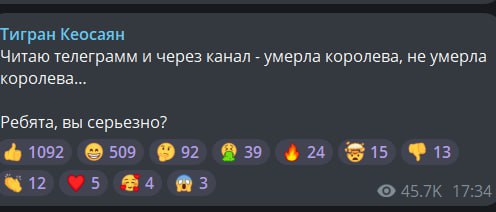 Нагадали українці і про його дописи щодо смерті королеви Єлизавети ІІ. Вони це перетворили у дотепний жарт. Суть у тому, що коли ходили чутки про смерть британської королеви, Кеосаян був обурений повідомленнями ЗМІ.