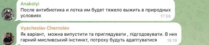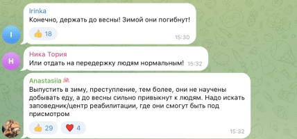 Але і тут спеціалісти зіштовхнулись з питанням, адже для самостійного зимування вони ще замалі, а тримати їх до весни проблематично. Однак у коментарях думка українців розділилась, хтось писав, що треба тримати котім до весни. А були і ті, хто наголошували, що їх можна випустити і підгодовувати, адже інстинкт виживання має допомогти хижакам.