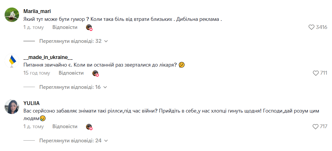 Танці з вінками та трунами викликали бурхливу реакцію в мережі. Коментатори не соромились у виразах — бажали нещастя дівчатам та їхнім родинам, а також тим коментаторам, які вподобали відео. Ба більше, їх вважають ледь не зрадницями, дорікаючи, що в цей час ховають багато військових.