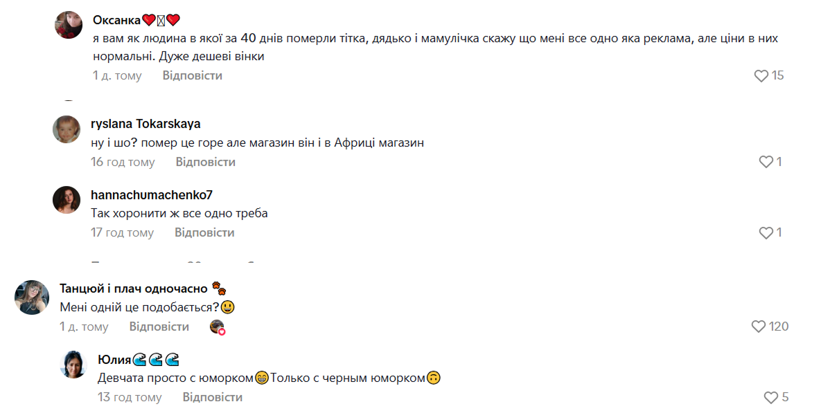 Проте знайшлись і ті, хто зрозумів, що бізнесу треба виживати і в складні часи. "Хоронити все одно треба", наголошують коментатори. Дехто оцінив і чорний гумор відео.