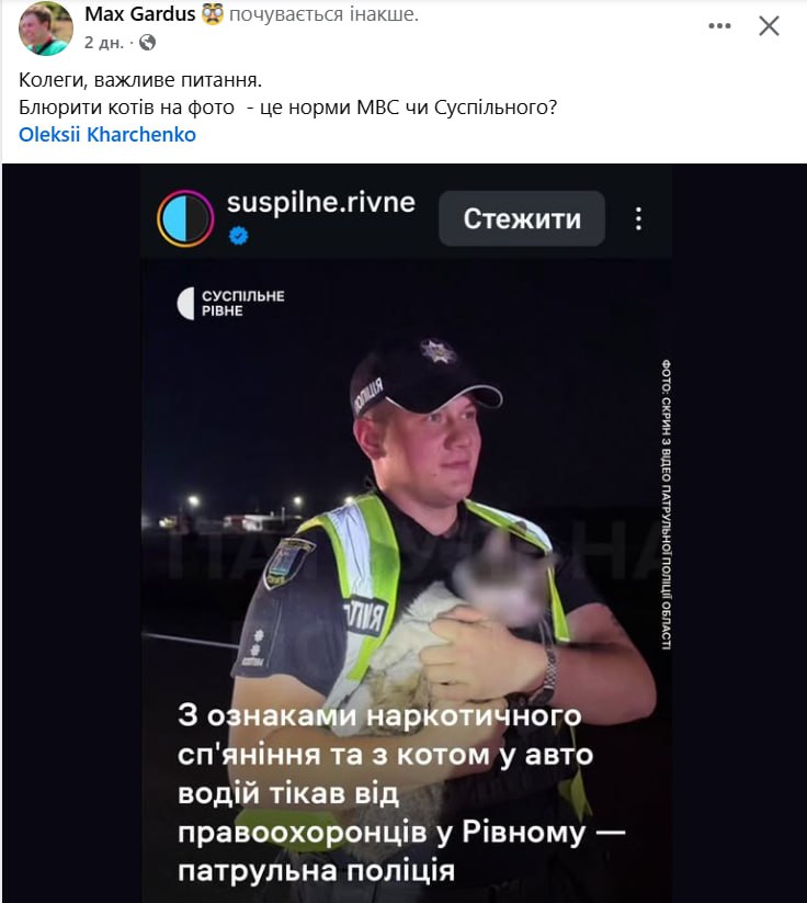 Через відео патрульної поліції із заблюреною мордою кота у громадськості виникла цікавість щодо того, чи є це обов'язковим. Зокрема політолог, фахівець зі стратегічних комунікацій Максим Гардус теж поставив це питання.