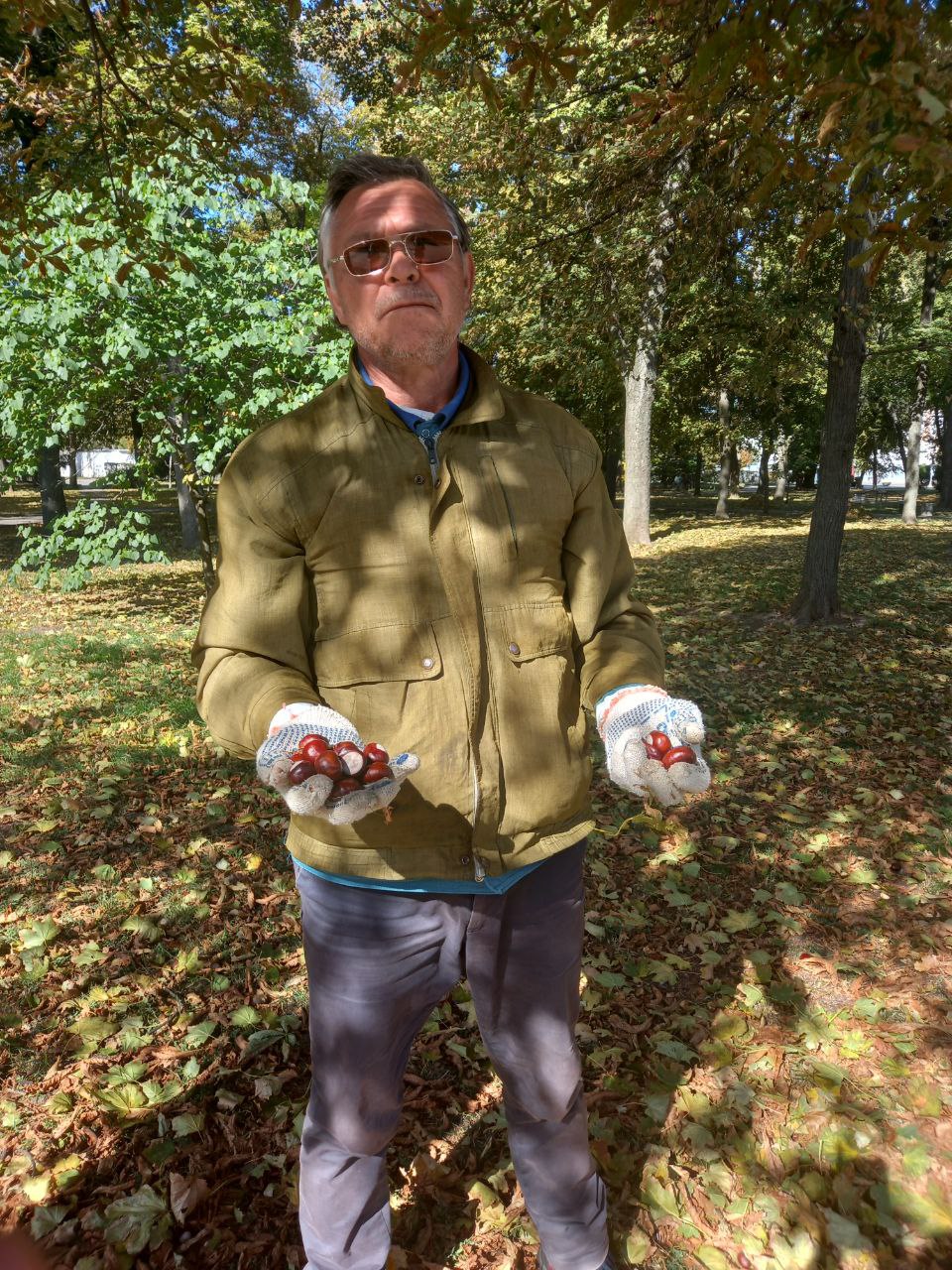 Чоловік не приховує, що знайшов "хлібне місце" на території Полтавської обласної клінічної лікарні. "Там повно каштанів, — хвалиться. — Хоча й конкуренти зустрічаються".