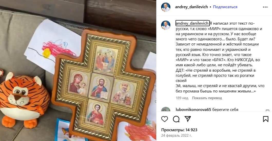 На своїй сторінці в Інстаграм у перші дні повномасштабного вторгнення Данилевич написав, що слово "мир" пишеться однаково і російською, і українською мовами. За словами ведучого, у росіян та українців було багато спільного, а той, хто знає слово "брат" не піде вбивати.