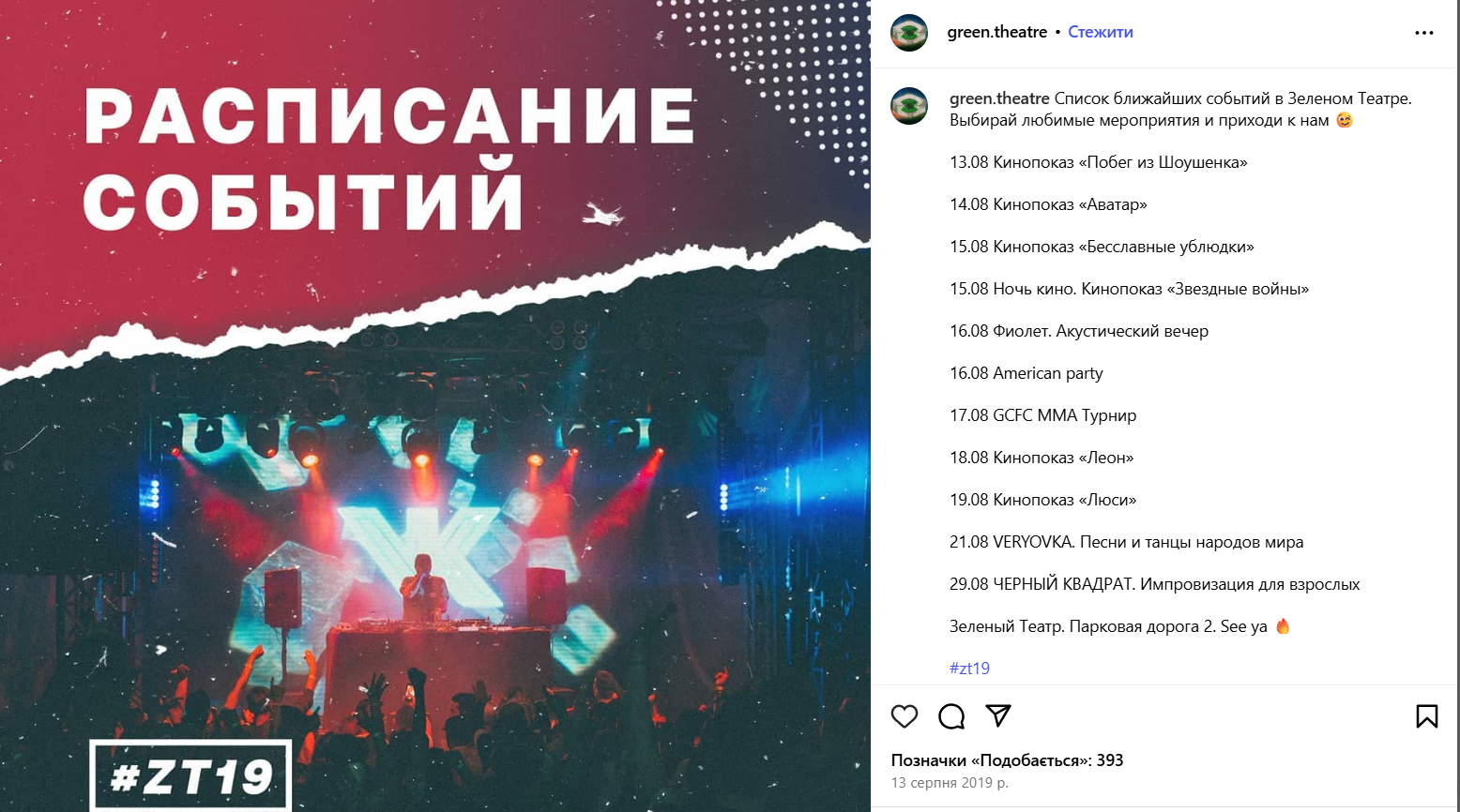 Саме у Зеленому театрі колишня вихователька дитячого садка Alyona Alyona презентувала свій дебютний альбом. На його сцені виступав культовий гурт Everlast і багато-багато інших.