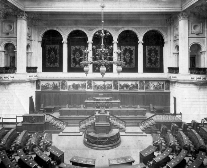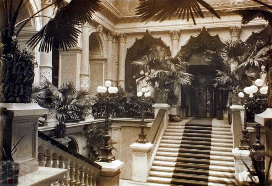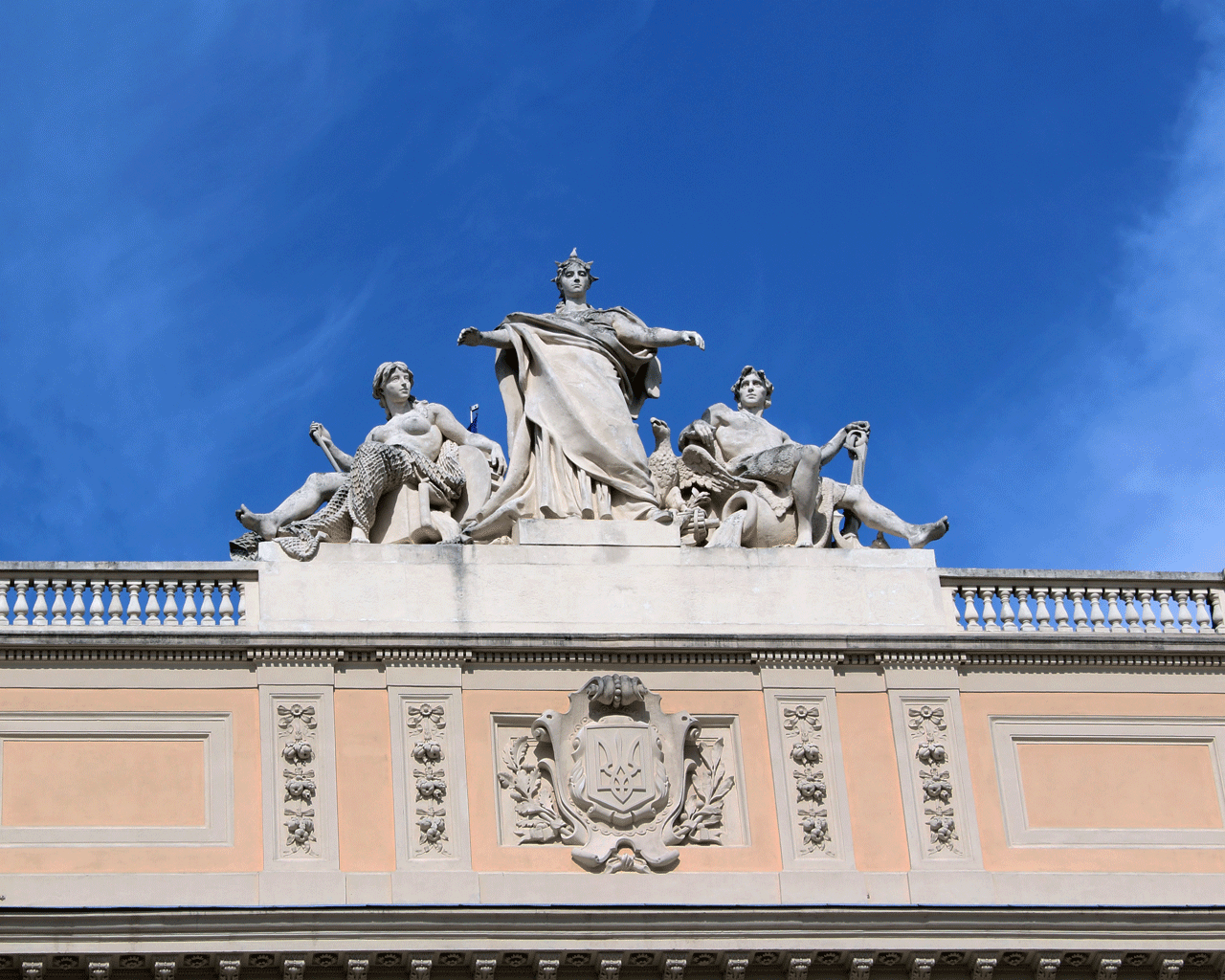 Скульптурне оздоблення будівлі не лише одне з найрозкішніших у Львові, а й сповнене символіки. Головна група — "Опікунський дух Галичини", створена у 1880–1881 роках Теодором Ріґером в Італії. У центрі композиції — жіноча постать Галичини, що простягає руки до Дністра та Вісли, символізуючи українців і поляків. За цю роботу Ріґер став почесним членом Флорентійської академії мистецтв.