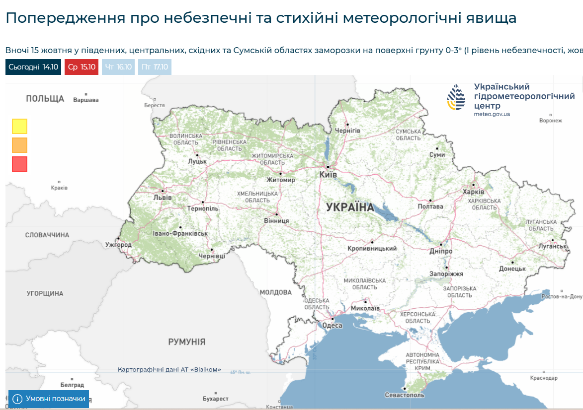 Про це попередив Український гідрометцентр. Вночі 15 жовтня на поверхні ґрунту будуть заморозки 0-3 градуси у південних, центральних, східних та Сумській областях. В цих регіонах через заморозки оголосили І рівень небезпечності, жовтий.