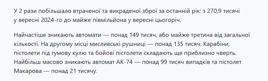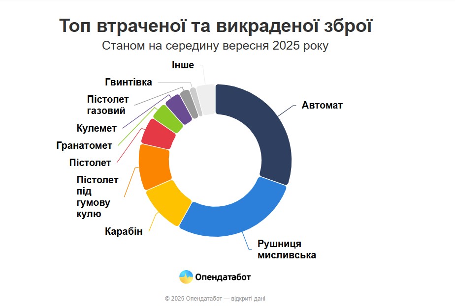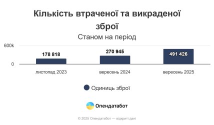 Від початку повномасштабного вторгнення понад 491 тисяча одиниць зброї була втрачена чи викрадена в Україні. При цьому лише за останній рік кількість зниклих автоматів, мисливських рушниць та пістолетів збільшилась на понад 200 тисяч