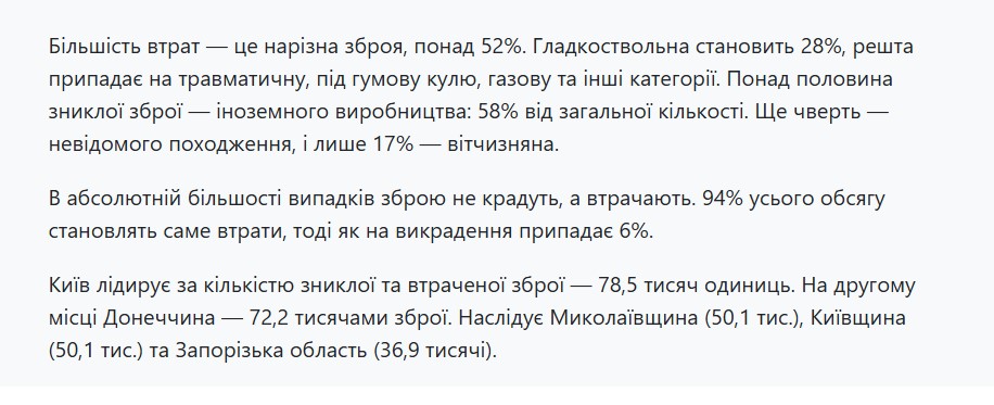 - І ключове питання, що робити з такою кількістю втраченої зброї? Можливо, спрацює зміна системи обліку чи інші кроки?