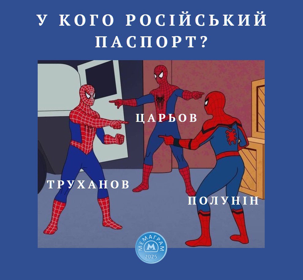 Творець мема зобразив трьох "спайдерменів", підписавши їх прізвища: Труханов, Царьов та Полунін. "Більше не українці" вказують пальцями один на одного у відповідь на запитання: "У кого російський паспорт?" Тут посилання на те, що Труханов тривалий час спростовував наявність у себе документа країни-агресора.