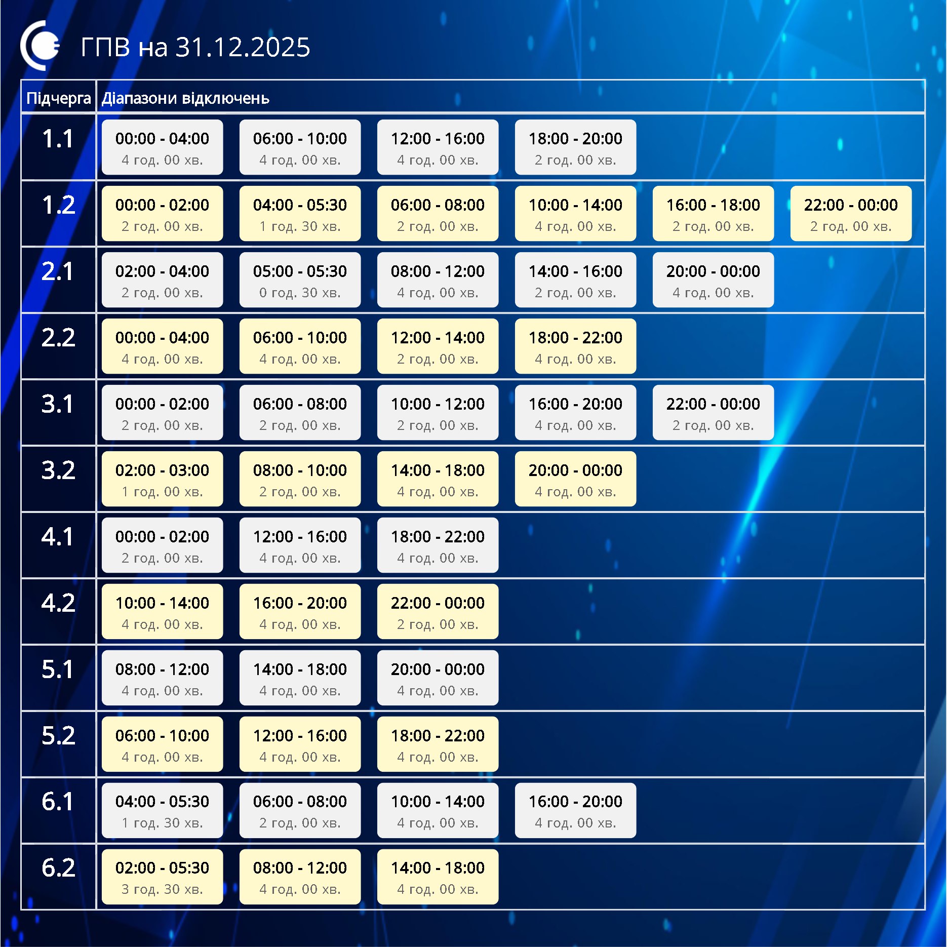 У середу, 31 грудня, графіки погодинних відключень та графіки обмеження потужності для промисловості застосовуються протягом усієї доби у більшості регіонів України, повідомляє "Укренерго".